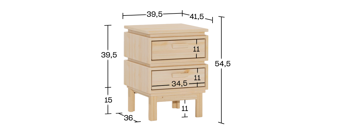Comodino con due cassetti piccoli e piedini, realizzato in legno naturale ecologico. Ideale per camerette o per spazi ridotti.