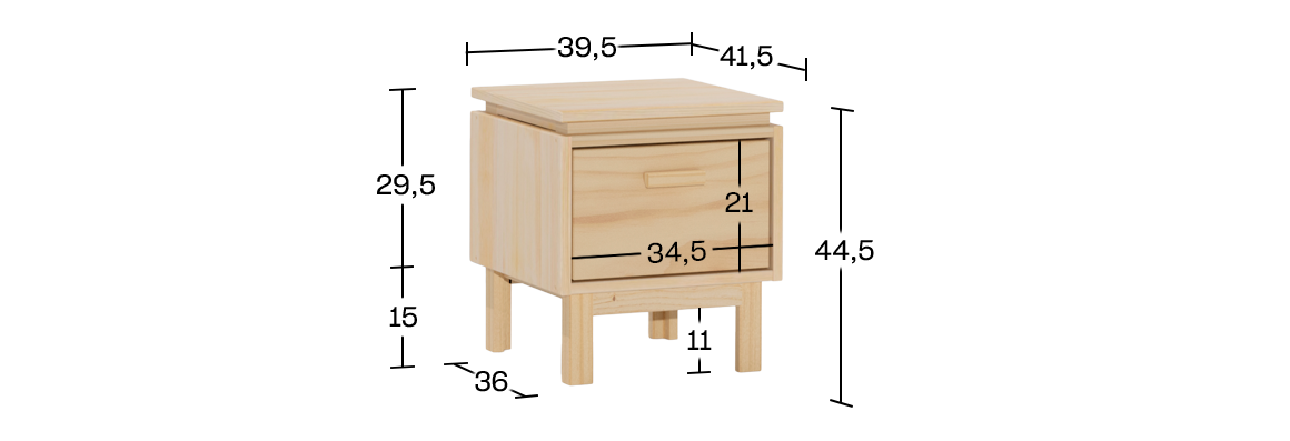 Comodino modulare realizzato in legno ecologico di pino. Una soluzione pratica per camere da letto piccole o camerette, con un cassetto contenitore dotato di guide integrate per un’apertura più semplice.