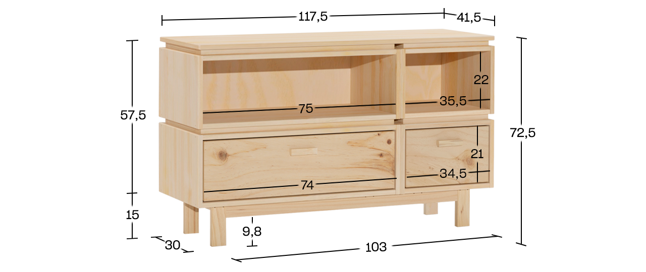 Mobile TV di design realizzato in legno ecologico e naturale, con un ampio piano superiore, due vani e due grandi cassetti contenitori. Questo mobile unisce funzionalità e design, pensato per adattarsi agli spazi più piccoli. Realizzato in legno ecologico certificato, permette di organizzare e riporre in modo efficiente, mantenendo uno stile fresco e senza tempo.