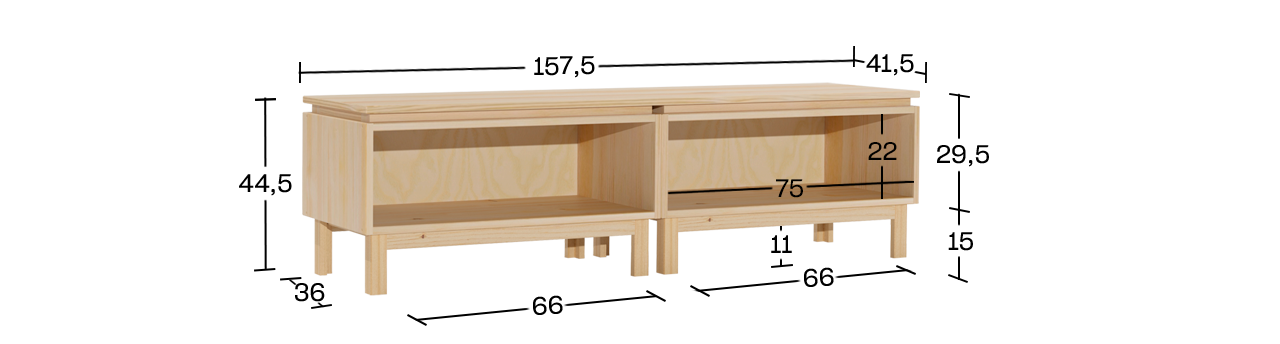 Mobile TV basso realizzato in legno ecologico e naturale, con un ampio piano superiore e due vani contenitori per scatole o ceste. Questo mobile unisce funzionalità e design per adattarsi ai diversi ambienti della tua casa. Realizzato in legno ecologico certificato, permette di organizzare e riporre in modo efficiente, mantenendo uno stile fresco e senza tempo.