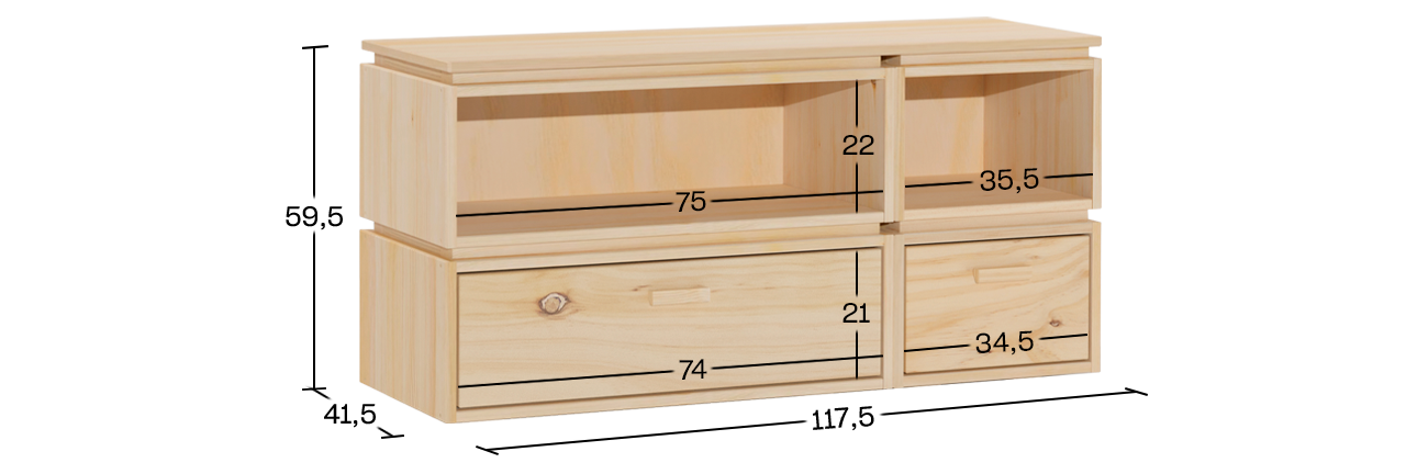 Mobile TV di design realizzato in legno ecologico e naturale, con un ampio piano superiore, due vani e due grandi cassetti contenitori. Questo mobile unisce funzionalità e design, pensato per adattarsi agli spazi più piccoli. Realizzato in legno ecologico certificato, permette di organizzare e riporre in modo efficiente, mantenendo uno stile fresco e senza tempo.