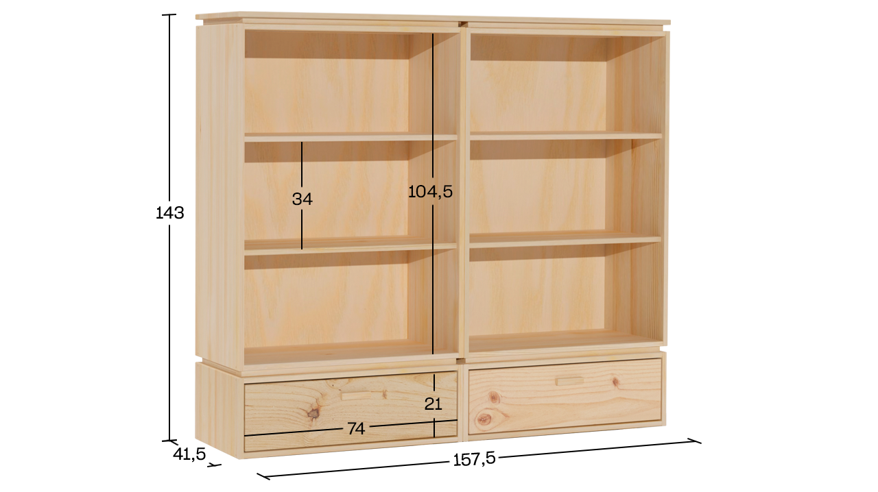 Scaffale doppio in legno naturale con cassetti contenitori per libri e oggetti decorativi. Ideale per soggiorni o spazi di studio e lavoro. Un mobile che unisce funzionalità e design ecologico, pensato per adattarsi ai diversi ambienti della tua casa. Organizza e ripone in modo efficiente, senza rinunciare allo stile.